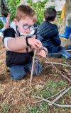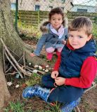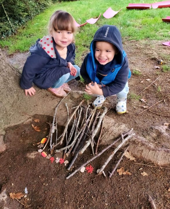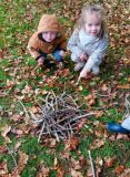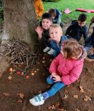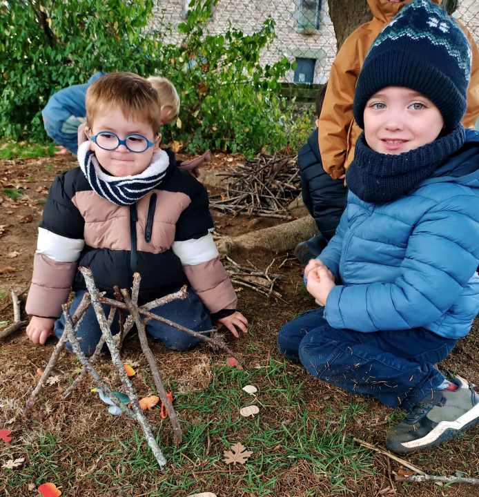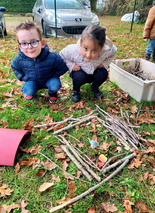 Dans cette histoire, le chat, l’écureuil et le canard vivent dans une cabane entourée de potirons. Nous avons coopéré pour construire ensemble des cabanes pour nos 3 figurines. Nous sommes devenus des architectes de la nature très créatifs!