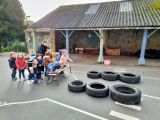 Nous avons joué au jeu de lancer « Grand ménage ». Des chaussettes qui traînent? On les lance bien haut chez le voisin… (Oui, c’est ce que Muriel nous a appris!) Puis, nous devions lancer des galettes de graines dans les pneus à différentes distances.